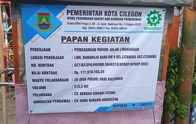 Berdasarkan hasil pantauan media dilapangan, pekerjaan pemasangan Paving Jalan Link, Ramanuju Baru RW 09, Kelurahan Citangkil, Kecamatan Citangkil, dengan nilai anggaran Rp 177.910.103,25, dengan luas volume 513,5 M2 di kerjakan oleh CV Berkah Sinergi Utama.